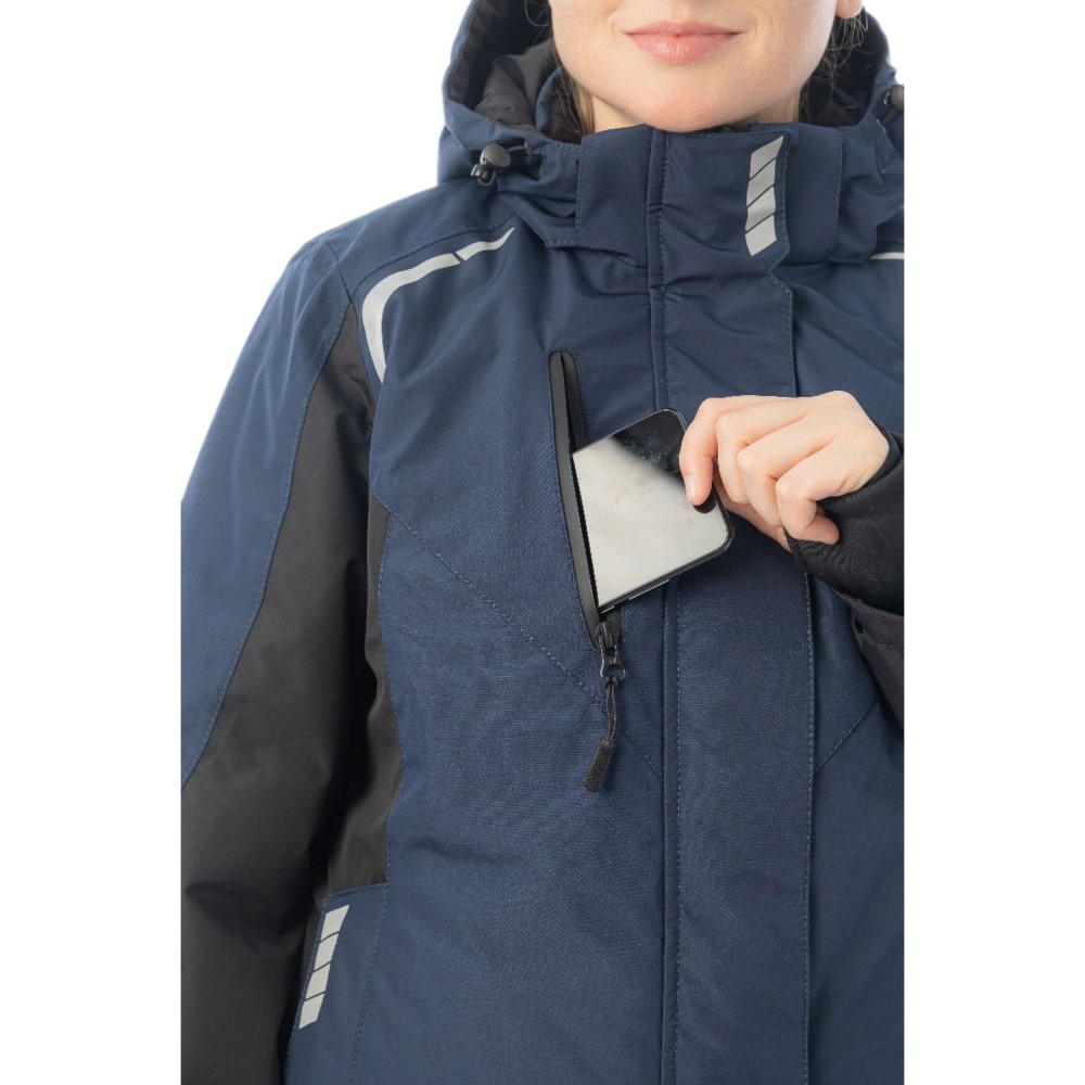 Женская куртка KW 208 - зимняя куртка с удлинённой спинкой. Предназначена для работ вне помещений в зимний период. Сшита из трёхслойной мембраны с водоотталкивающей пропиткой. Мембрана с показателями 10000/10000 гарантирует надёжную влаго- и ветрозащиту. Утеплитель Shelter Micro 240 г и теплоотражающая вставка на подкладке отвечают за сохранение тепла.